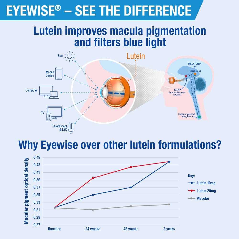 Eyewise® delivers a full 20 mg of pure lutein per tablet. You’ll also find concentrated extracts of bilberry, blackberry and grapeseed polyphenols in each tablet. The formula includes zinc and riboflavin (vitamin B₂). There is also lutein, the essential yellow carotenoid. Daily intake is 1 tablet.