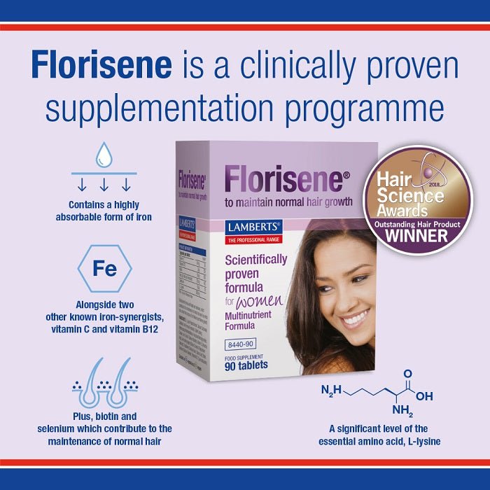 Florisene® for Women is a carefully formulated iron-based supplement. It contains a form of iron that’s gentle on the stomach, paired with L-Lysine and supporting nutrients like vitamin C, biotin, selenium, and vitamin B12. Each tablet is small, coated for ease, and free from artificial additives. The tablet disintegrates in under an hour and just one tablet is taken a day.