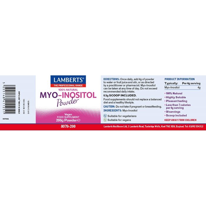 Lamberts® Myo-Inositol Powder offers a simple way to add myo-inositol. Myo-inositol is found naturally in foods like fruits, beans, and nuts, is produced by the body. This powder is 100% natural and provides a convenient dose of 4g. The powder is fine, white, highly soluble and has a pleasant taste, so it mixes easily into water or juice. Lamberts® Myo-Inositol Powder is suitable for vegetarians.