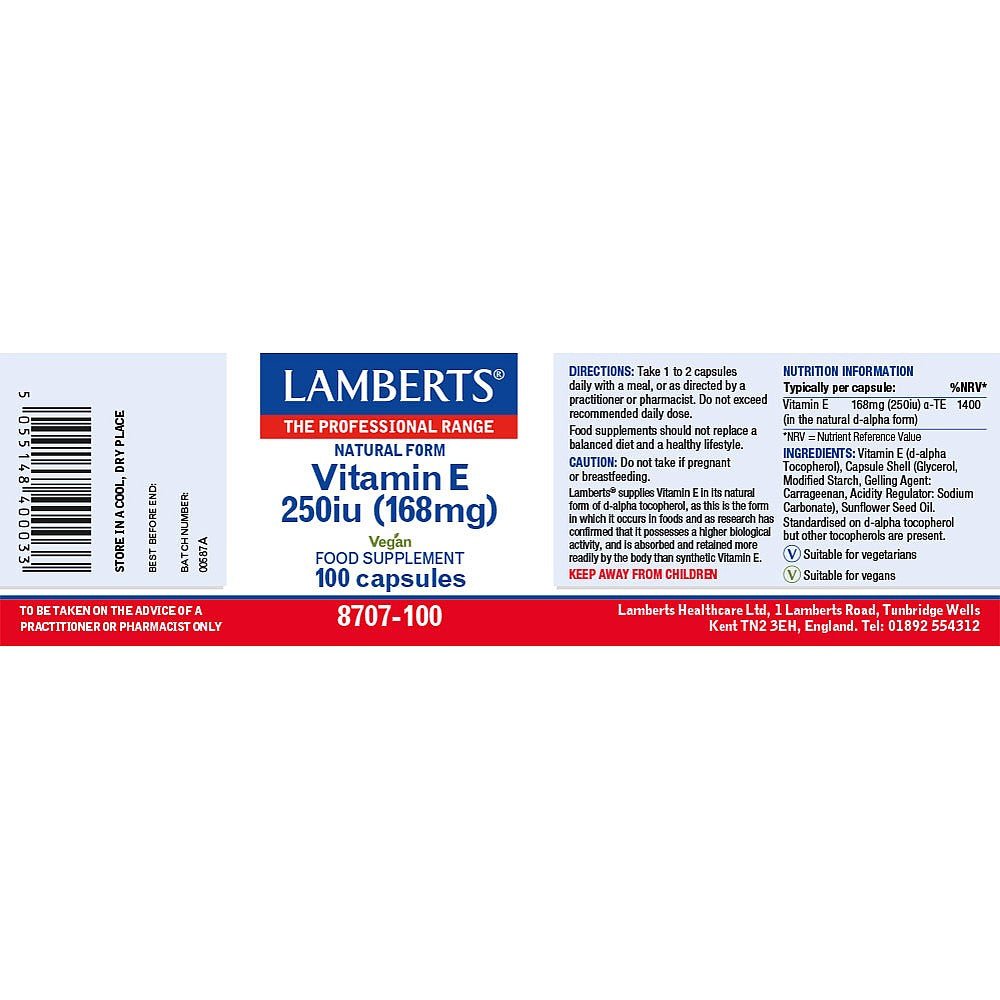 Lamberts Natural Vitamin E 250 I.U. brings you vitamin E in the natural form of d-alpha tocopherol, the same type found in foods. Each capsule contains vitamin E sourced from natural vegetable oil. These capsules don’t contain gelatin, making them suitable for vegetarians.