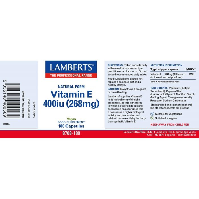 Lamberts Natural Vitamin E 400 I.U. - 180 Caps - RightNutri-Supplements