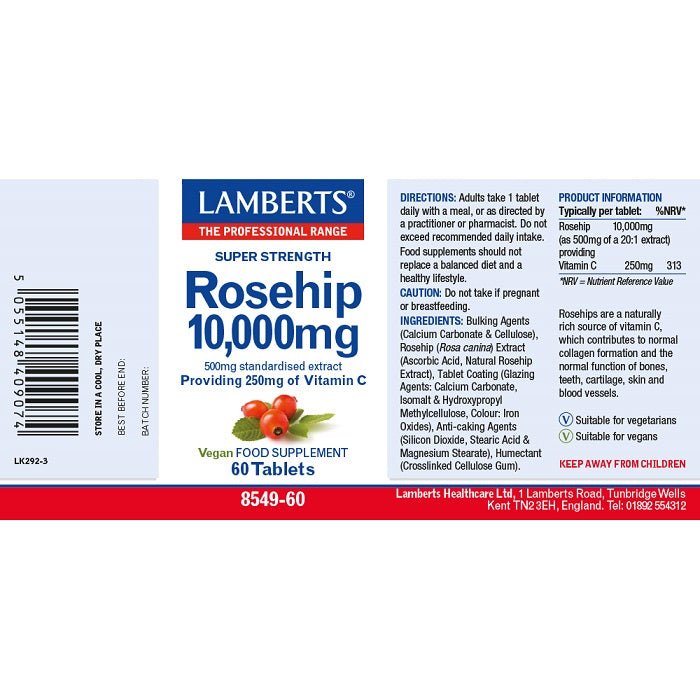 Lamberts Super Strength Rosehip 10,000mg tablets are made from carefully sourced rosehips. Each tablet delivers 500mg of standardised rosehip extract, taken from 10,000mg of dried rosehips. They are naturally rich in vitamin C. These tablets are suitable for vegetarians.